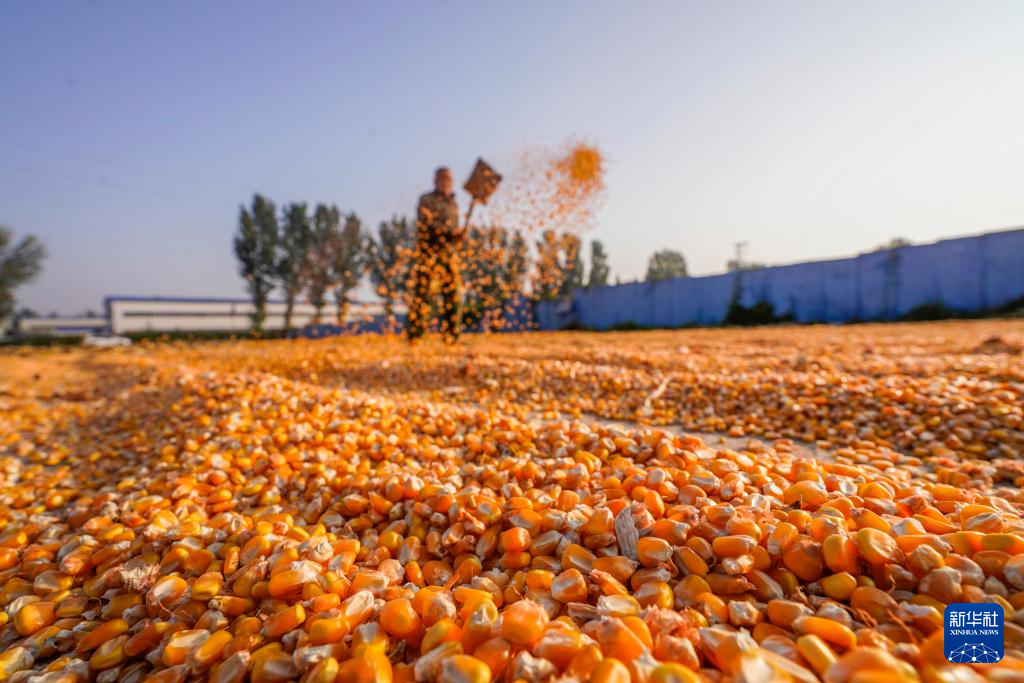10月4日,在山东省枣庄市西王庄镇付刘耀村,农机手驾驶农用机械晾晒收获的玉米。