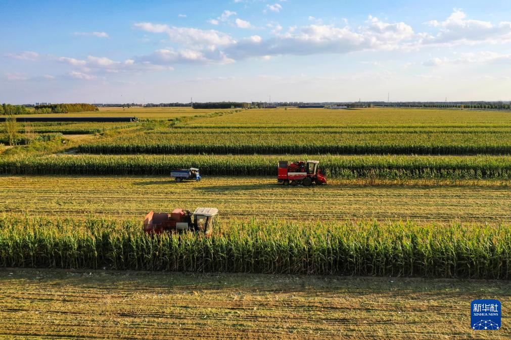 10月1日,在山东省东营市广饶县稻庄镇闫家村,农民驾驶收割机收割玉米(无人机照片)。