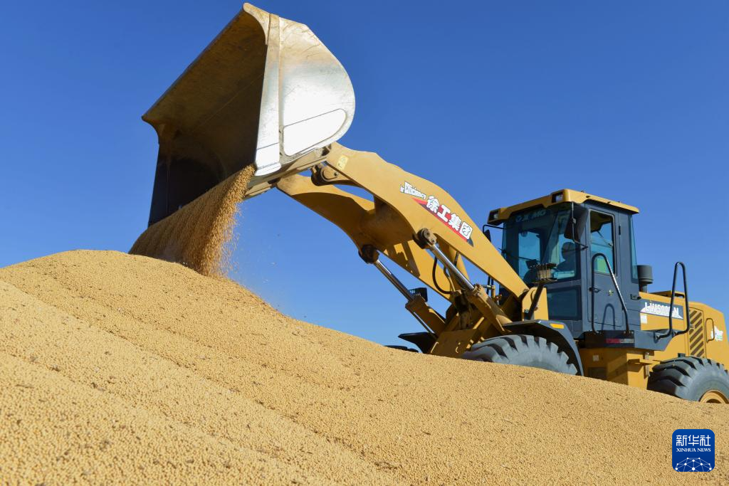 10月3日,在北大荒集团北安分公司尾山农场有限公司第五管理区,铲车在倒运大豆。