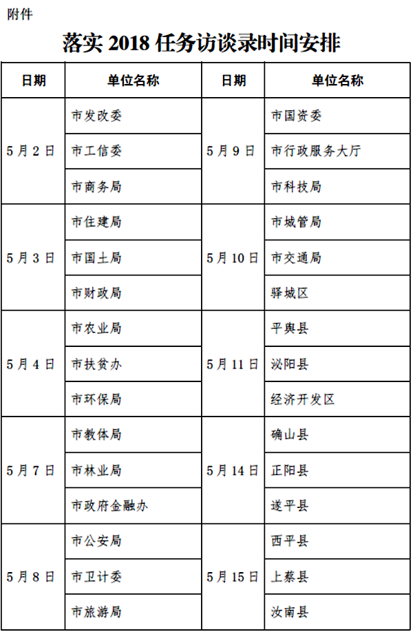 访谈对象为《驻马店市人民政府关于印发<2018年市政府工作目标责任考核奖惩办法(试行)>的通知》(驻政〔2018]14号)中确定的12个县区政府(管委会)、54个市直单位、驻驻单位和其他单位等考核对象。