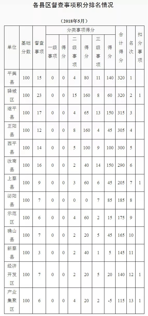 【驻马店广视融媒讯】2018年5月份,参与积分排名的事项共320项,其中市长安排各类重要事项154项,市长批示件督办事项33项,人大建议政协提案已办结事项86项,表扬批评类事项47项。参与排名的县区和市直单位64个,经督查“一张网”系统大数据自动排名统计,对县区、市直单位全部完成督查事项分别排名前三位的平舆县、遂平县、正阳县、市农业局、市城管局、市住房管理中心进行通报表扬。