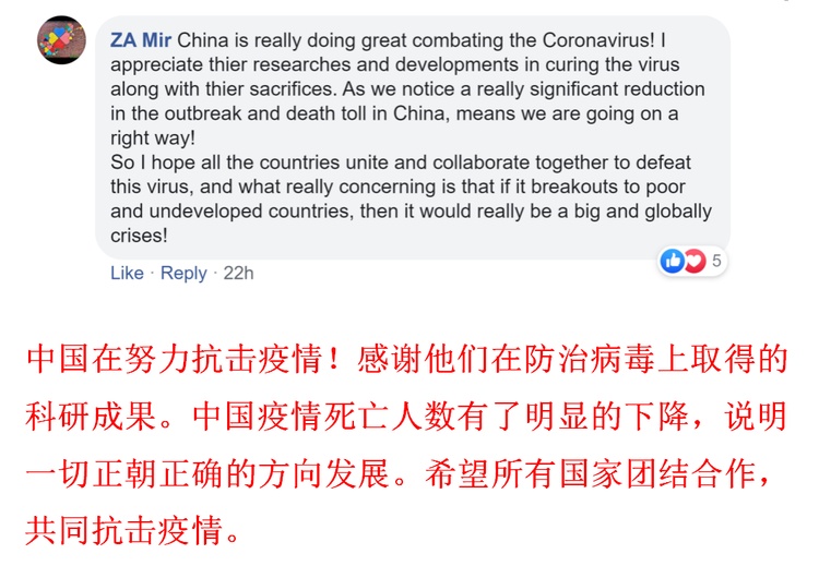 海外网友对于中国初步遏制疫情蔓延势头表示肯定,并点赞中国领导人巨大的政治勇气和责任担当。