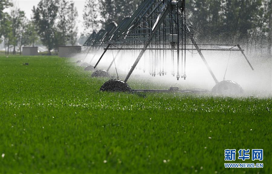 在河南省浚县的麦田里,一台喷灌机在进行喷灌作业(4月24日摄)。 新华社记者 李嘉南 摄
