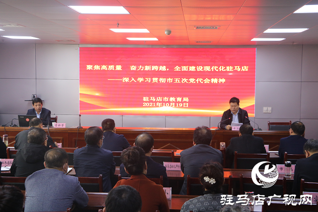 他强调,一要提升政治站位,统一思想认识。市直教育系统各级党组织和广大党员干部要把学习贯彻市五次党代会精神作为重大政治任务,切实把思想和行动统一到市五次党代会的精神上来,统一到市五次党代会作出的决策部署上来,统一到局党组的要求上来。要全面深入学习,准确领会精神实质,以高度的政治自觉、思想自觉和行动自觉推动市五次党代会精神学到深处、落到实处。二要明确重点任务,细化责任分工。教育是最大的民生工程,涉及千家万户,寄托着人民群众对美好生活的向往,更是一个地区发展水平和发展潜力的重要标志。市五次党代会把实施教育优先发展战略作为十大战略的第一项,充分显示了新一届市委市政府对教育事业更加重视,充分显示了推动教育高质量发展的信心和决心。市委书记鲍常勇非常重视教育,每到县区调研,必看教育。一定程度上说明,教育迎来了发展的春天,另一方面也给我们身上增添了更多的责任和担当。市直教育系统各级各部门要把学习宣传贯彻市五次党代会精神与本单位本部门的工作实际结合起来,把学习市五次党代会精神与破解教育发展难题结合起来,抓紧研究制订贯彻落实市五次党代会精神的具体措施,找准弱项短板和问题症结,细化责任分工,明确对策措施,强力推动落实。三要精心组织部署,兴起学习热潮。市直教育系统各级党组织要把学习宣传贯彻市五次党代会精神作为各级党组织理论中心组学习的重要内容,把学习宣传贯彻市五次党代会精神和党史学习教育结合起来,集中开展市五次党代会精神宣讲活动,积极营造学习宣传贯彻的良好氛围,要提升站位学,着眼全局学,立足岗位学,重抓落实学。切实用党代会精神武装头脑、指导工作。要以学习宣传贯彻市五次党代会精神为契机,把教育系统广大党员干部群众的积极性、主动性、创造性调动起来,奋力推动全市教育高质量发展,为实现“六个现代化驻马店”作出教育系统应有的贡献。