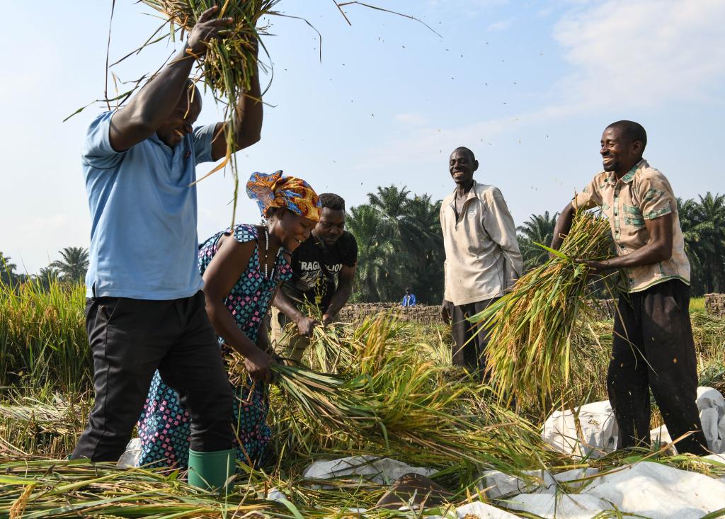 2023年6月20日,在布隆迪布班扎省基航加县,农民在田间给杂交水稻脱粒。多年来,中国派出农业专家深入布隆迪各地,对当地稻农提供技术指导,为粮食增产增收做出重要贡献。新华社记者 韩旭 摄