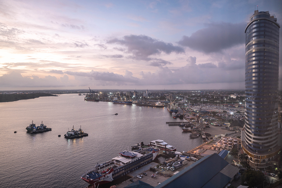 这是2023年12月29日拍摄的日出时分的坦桑尼亚达累斯萨拉姆港。新华社记者 王冠森 摄
