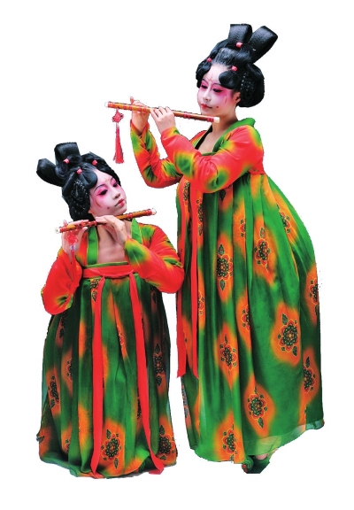 记者了解到,为体现丰腴的唐俑形象,演员们穿着塞海绵的连体衣,嘴里含着棉花登台演出,而眼角两道月牙形的妆容,也完全再现了风靡于唐代的女性面部潮流妆容“斜红”。