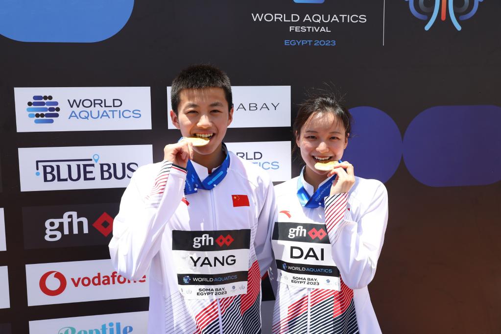5月14日,获得女子单人自由自选冠军的戴诗意(右)在颁奖仪式上与获得男子单人自由自选冠军的杨顺诚合影。新华社发(艾哈迈德·戈马摄)