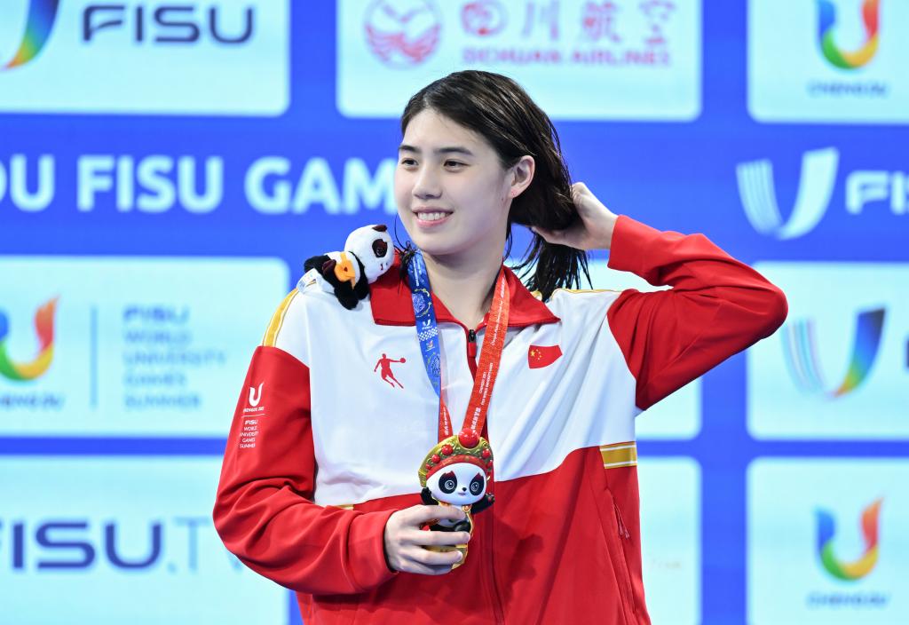 8月2日,张雨霏在女子50米蝶泳颁奖仪式上。新华社记者陈泽国摄