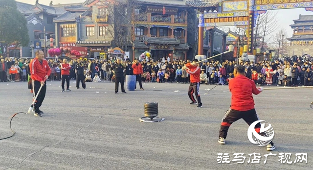 在皇家驿站大牌坊门前,人潮涌动,来自驿城区、新蔡县、西平县、遂平县和信阳市的老体协代表队参加展演,近万名群众和游客观看。