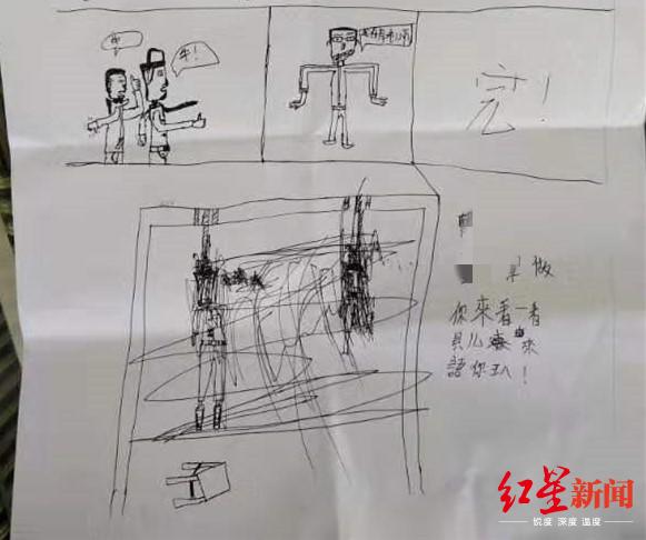 “10日下午,妻子在整理儿子遗物时,在书包中发现了这张漫画。漫画中,一人用绳子自尽,旁边写有儿子的名字。”刘明照说,他们怀疑儿子在学校遭遇了暴力。