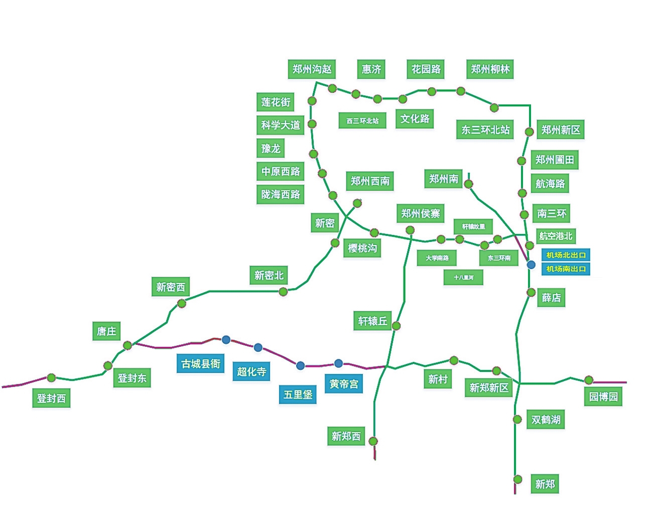 具体为:郑州圃田站、郑州南站、郑州新区站、航海路站、南三环站、郑州柳林站、郑州沟赵站、惠济站、花园路站、文化路站、东三环北站、西三环北站、郑州侯寨站、豫龙站、樱桃沟站、十八里河站、轩辕故里站、中原西路站、科学大道站、陇海西路站、大学南路站、东三环南站、莲花街站、郑州西南站、新密站、新密北站、新密西站、唐庄站、登封东站、登封站、轩辕丘站、新郑西站、双鹤湖站、航空港区北站、薛店站、新郑站、园博园站、新郑新区站、新村站。