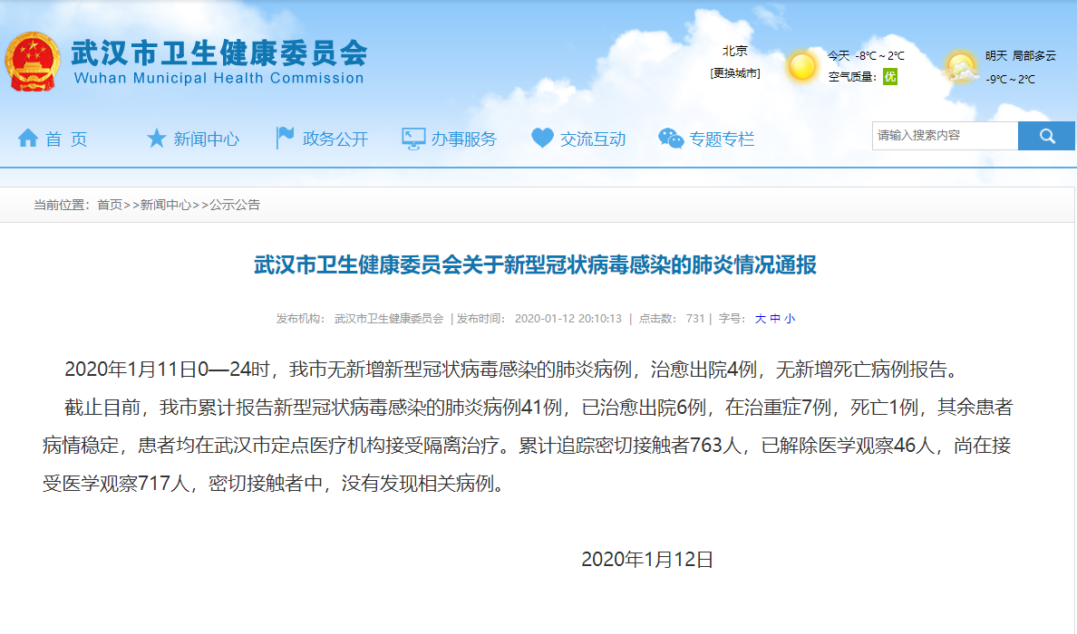 人民网北京1月12日电 据武汉市卫生健康委员会网站消息,2020年1月11日0—24时,武汉市无新增新型冠状病毒感染的肺炎病例,治愈出院4例,无新增死亡病例报告。