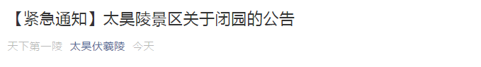 根据对新型冠状病毒肺炎的防控工作需要,为切实保障广大人民群众的身体健康与生命安全。太昊陵管理处决定即日起(2020年1月24日,农历大年三十)暂时闭园,恢复开放时间根据情况另行通知,敬请您的理解、支持和配合。请广大游客朋友们相互转告!已经网上购票的游客,太昊陵管理处将尽快通过原付款渠道退还票款,并通过您预留的手机号码通知退款信息。