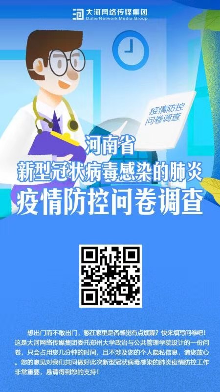 想出门而不敢出门,憋在家里是否感觉有点烦躁?快来填写问卷吧!这是大河网络传媒集团委托郑州大学政治与公共管理学院设计的一份问卷,只会占用您几分钟的时间,且不涉及您的个人隐私信息,请您放心。您的意见对我们共同做好此次新型冠状病毒感染的肺炎疫情防控工作非常重要,恳请得到您的支持!