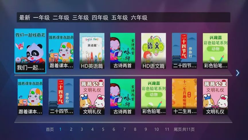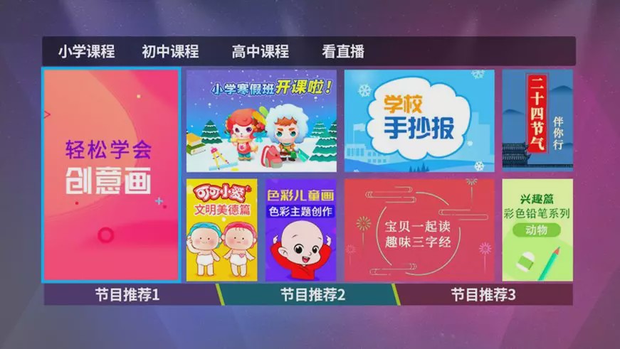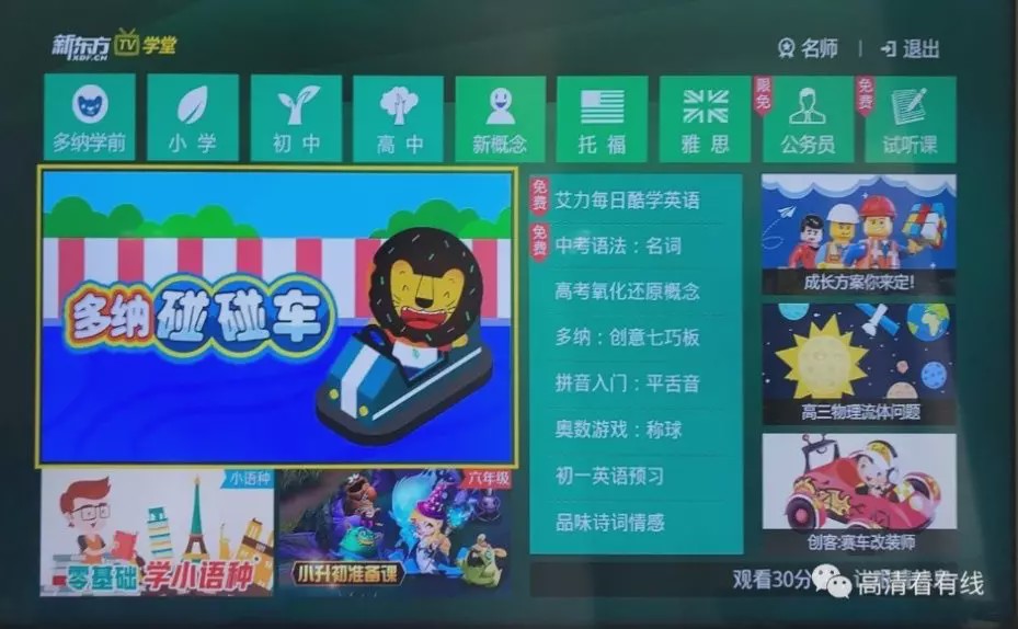1、普通用户在看直播的状态下按遥控器数字键777,即可进入《名校同步课堂》。按上下键切换年级,点击“确认键”即可全屏观看。