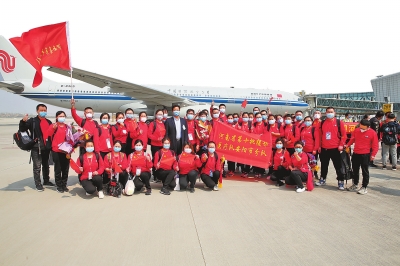 3月24日中午,河南省第十批支援湖北医疗队圆满完成任务,乘坐专机返回河南。河南日报记者 聂冬晗 摄