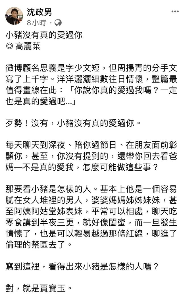 沉政男表示,看了周扬青写的千字文分手信,周扬青认为小猪在交往过程中对她很好,会经常聊天聊到深夜、带她回家见父母、陪她过节等,认为小猪应该是真的爱过她,不理解为何爱她又会伤害她,但沉政男却认为“小猪没有真的爱过你”。