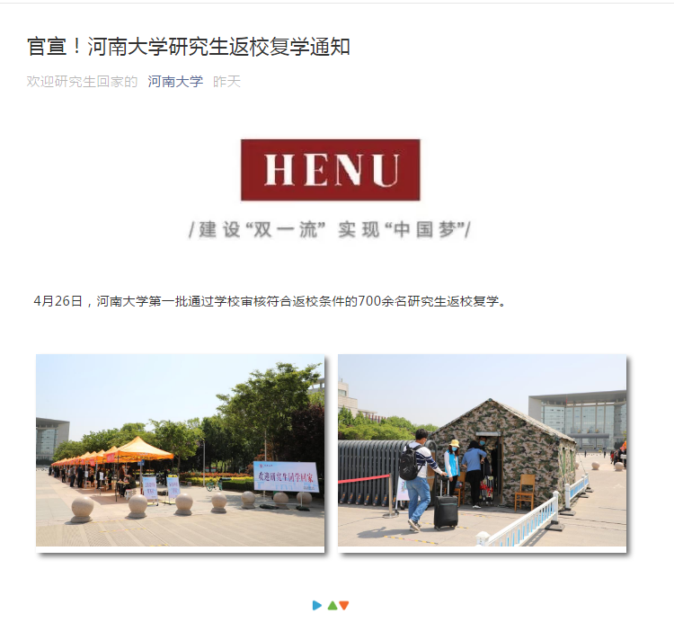 据河南大学官方网站,5月13日—14日,具有河南大学学籍的全体全日制研究生返校复学。拟自愿返校的研究生须通过“今日校园”APP填写提交个人申请,培养单位审核,研究生院审批后方可返校。
