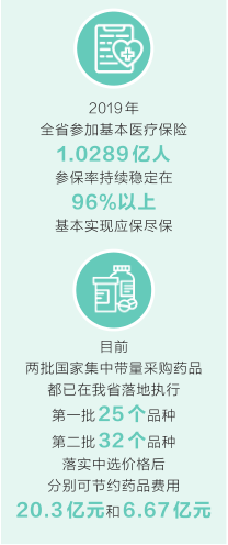 省医疗保障局党组书记、局长郑子健在发布会上介绍,2019年,全省参加基本医疗保险1.0289亿人,参保率持续稳定在96%以上,基本实现应保尽保。