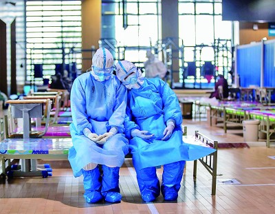 在武昌方舱医院,青海医疗队队员刘海婷(左)与许国娟在等待出舱时小憩(3月10日摄)。新华社发