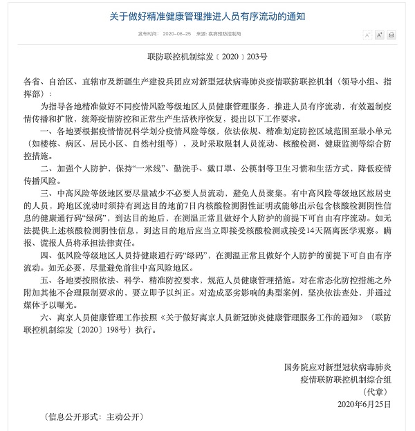 6月25日,国家卫健委发布《关于做好精准健康管理 推进人员有序流动的通知》。《通知》针对不同疫情风险等级地区做好人员健康管理服务提出明确要求。其中,中高风险等级地区尽量减少不必要人员流动,避免人员聚集。低风险等级地区人员持健康通行码“绿码”,在测温正常且做好个人防护的前提下可自由有序流动。如无必要,尽量避免前往中高风险地区。《通知》要求各地立即纠正在常态化防控措施之外附加的限制人员流动的不合理措施,坚决依法查处并曝光造成恶劣影响的典型案例。