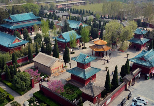 嘉应观始建于1723年,是雍正为了纪念在武陟修坝堵口、祭祀河神、封赏治河功臣而建造的淮黄诸河龙王庙,建筑布局效仿故宫,集宫、庙、衙署为一体。观内有雍正亲自撰文并书写的铜碑,立在一河蛟身上,意在镇恶。