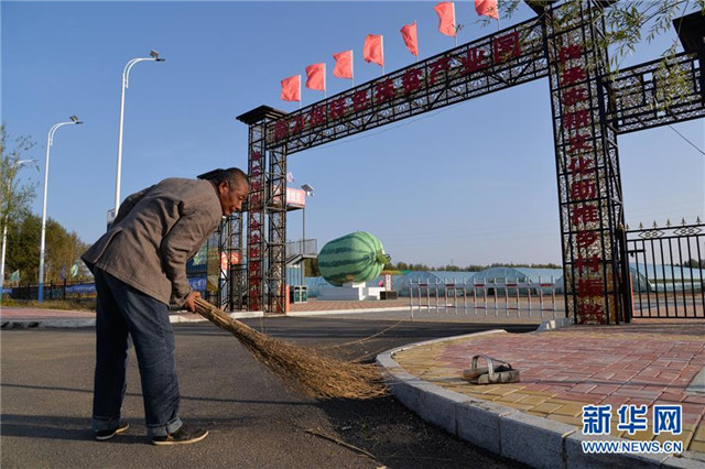 村民腾宪奎在内蒙古兴安盟科尔沁右翼前旗居力很镇扶贫产业园打扫卫生(9月30日摄)。 新华社记者 徐钦 摄