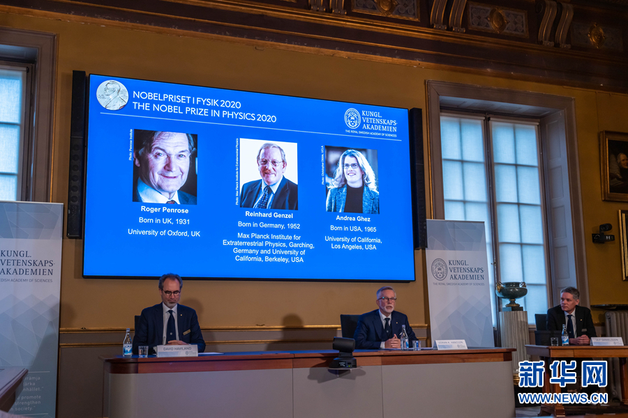 10月6日,在瑞典斯德哥尔摩,瑞典皇家科学院公布2020年诺贝尔物理学奖获得者。 新华社发(魏学超摄)