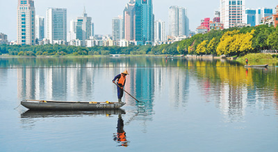 10月2日,工人在广西南宁市南湖进行水面保洁。