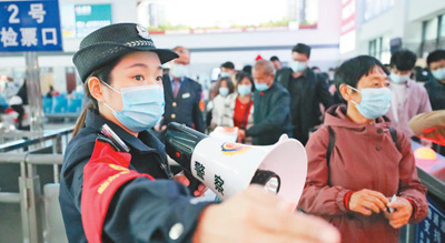 10月6日,一名铁路公安民警在山西运城北站进站口维持秩序。