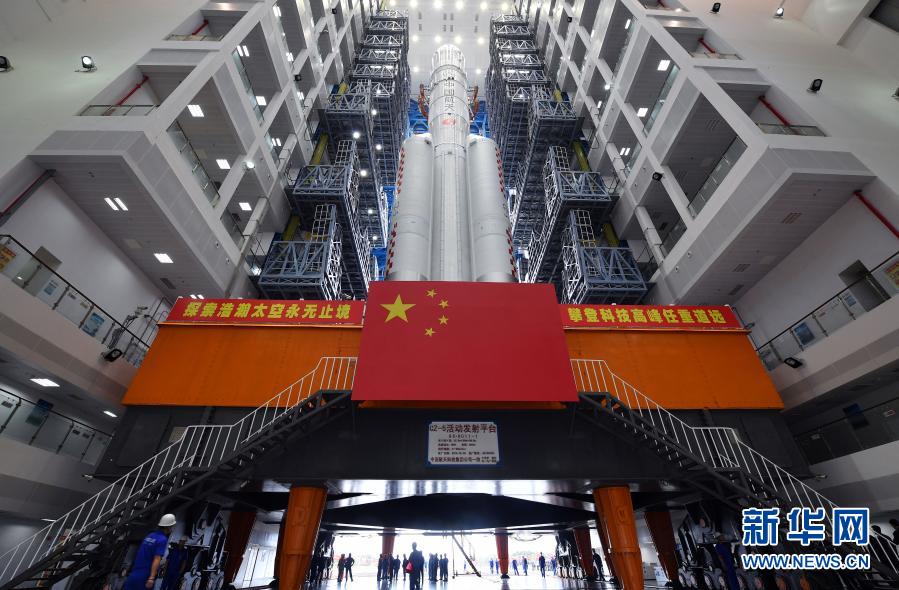 11月17日,长征五号遥五运载火箭和嫦娥五号探测器在中国文昌航天发射场完成技术区总装测试工作后,垂直转运至发射区,计划于11月下旬择机实施发射。新华社记者 郭程 摄