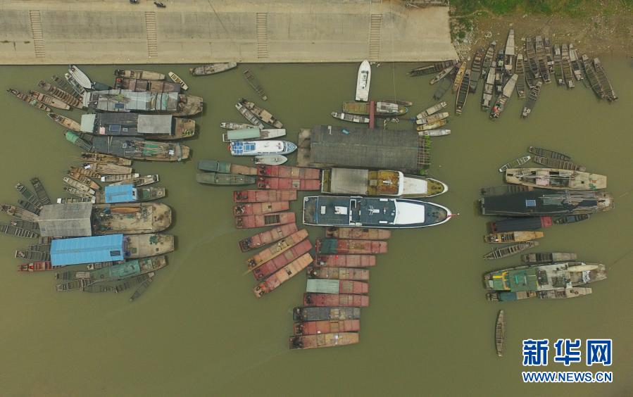 在湖南常德汉寿县蒋家嘴镇,待回收的铁渔船停靠在洞庭湖边(2019年12月17日摄,无人机照片)。2020年1月1日零时起,长江流域332个自然保护区和水产种质资源保护区全面禁止生产性捕捞。新华社记者 薛宇舸 摄