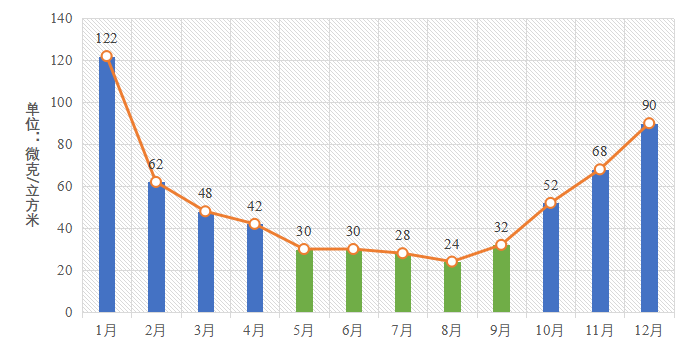 PM2.5浓度连续5个月达到国家空气质量二级标准:5月份30微克/立方米、6月份30微克/立方米、7月份28微克/立方米、8月份24微克/立方米、9月份32微克/立方米。