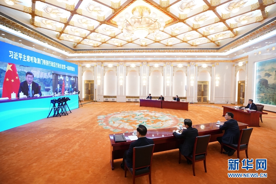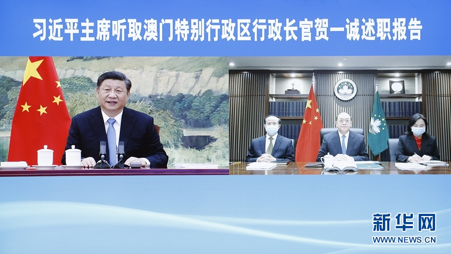 1月27日,国家主席习近平在北京以视频连线方式听取了澳门特别行政区行政长官贺一诚2020年度的述职报告。新华社记者 刘彬 摄