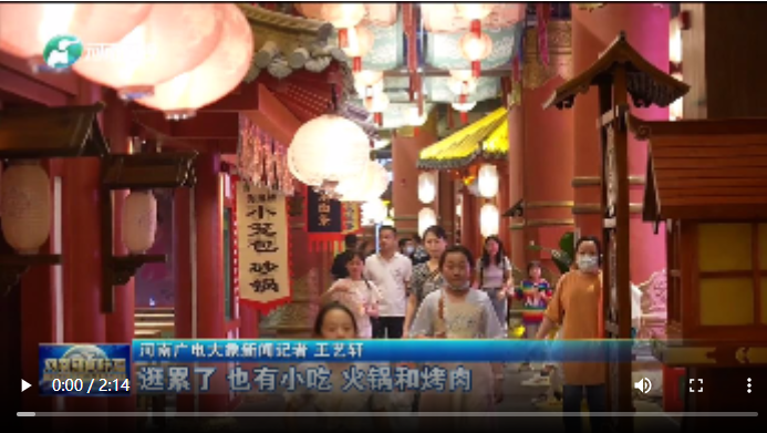 河南广电大象新闻记者 王艺轩:逛累了,也有小吃、火锅和烤肉,碰一杯冰饮料,来一场古风与现代的碰撞。