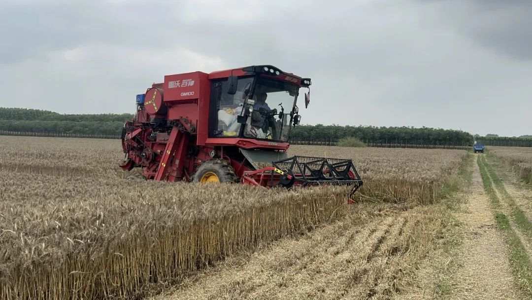 记者看到,农机在地里驰骋,拉麦车也开进了麦田。一台收割机的谷仓容量是3000斤,大约每收割两三亩地,农机手就需要把收割机里的麦子卸下来。金色的麦粒从收割机里倾泻而下,农民张婷婷抓起一把查看,喜笑颜开:“这麦子终于全部收上来了,心里踏实了!”