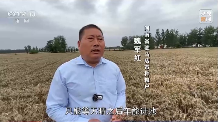 河南省驻马店市种粮户魏军红:下雨期间虽说成熟了,想收也收不成,只能等天晴之后车能进地,也就是说昨天(周四)才开始收割。