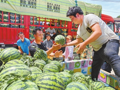 “老赵,这一车又发往哪去?你今天发几车西瓜了?”“这是第三车,发往北京新发地市场。”收购商赵如清一边说笑,一边挑拣着西瓜,往货车上装。