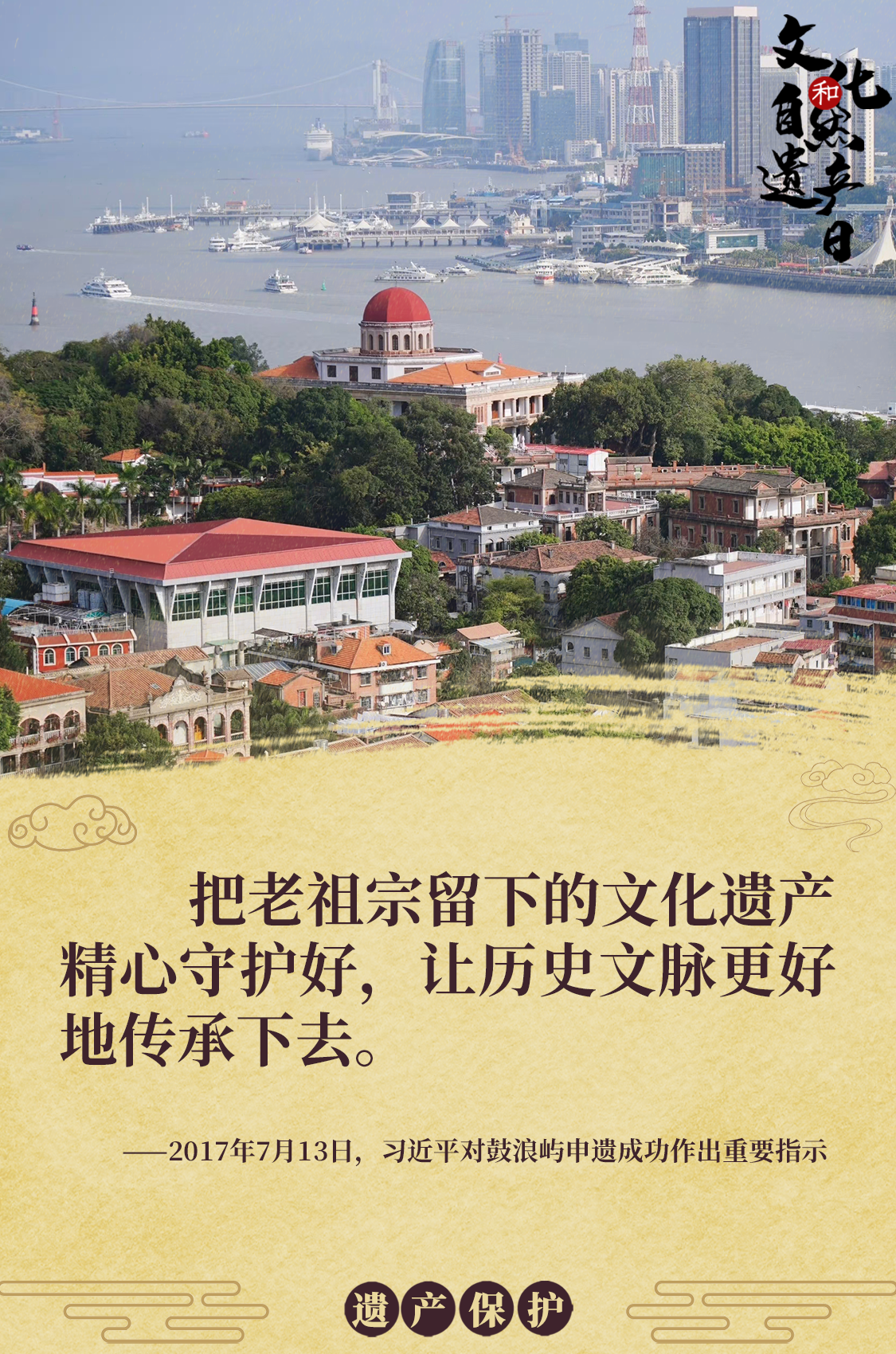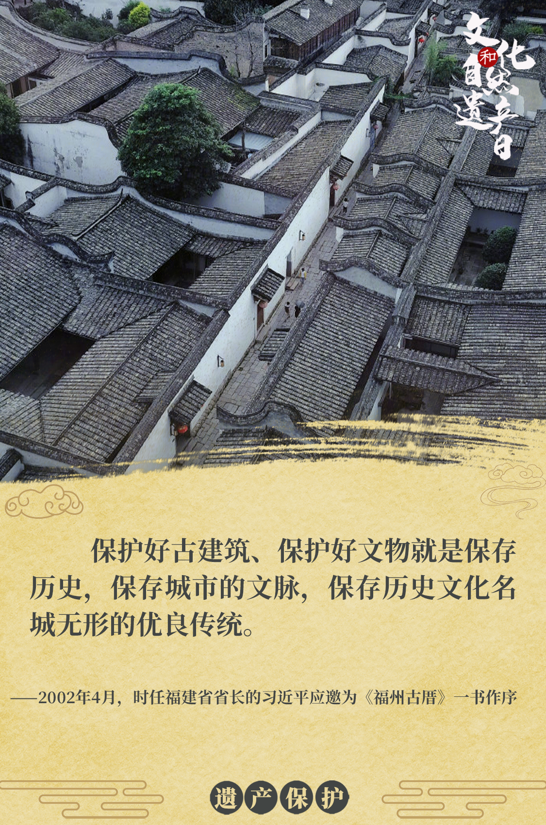 一直以来,习近平高度重视中华优秀文化和自然遗产的保护工作,为《福州古厝》作序、保护三坊七巷、多次踏访历史文化古迹,强调历史文化遗产的保护与传承。