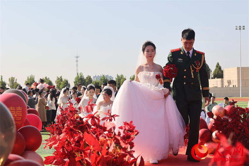 婚礼现场,新娘们在主持人的指引下纷纷抛出象征爱情的手捧花,将幸福和甜蜜传递给场下的单身官兵。浪漫与誓言相守,忠诚与奉献交融,从此,31位新郎肩上多了一份责任与担当;31位新娘有了一个光荣的称呼——“军嫂”。