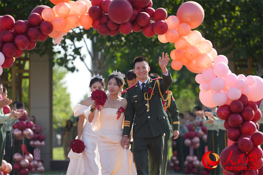 新郎新娘向官兵挥手。