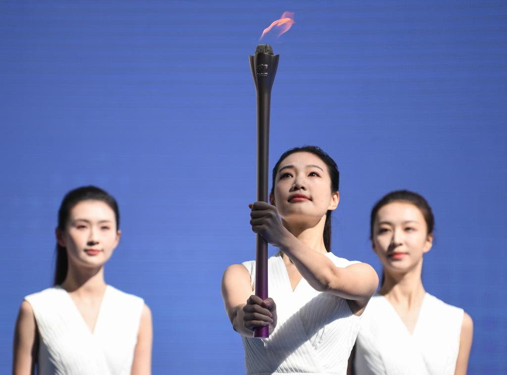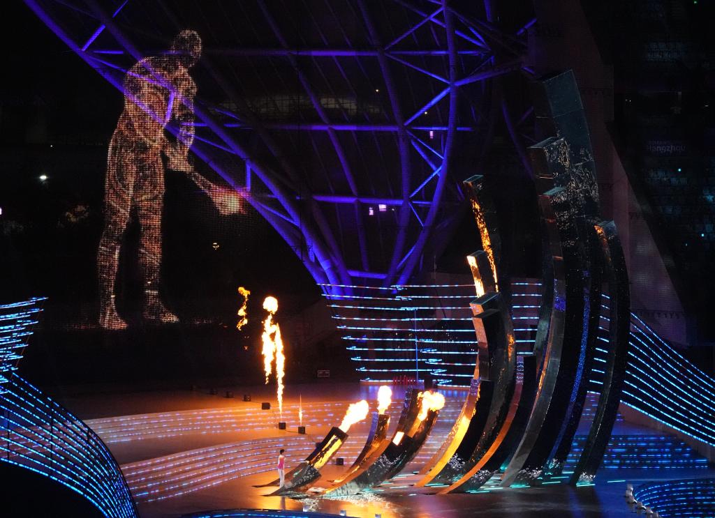 数字人“弄潮儿”和汪顺共同点燃主火炬塔