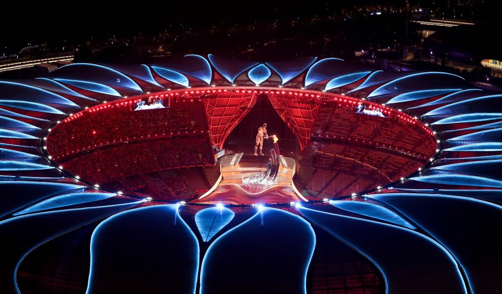 亚残运会最后一棒火炬手的机械手臂与“桂冠”交握