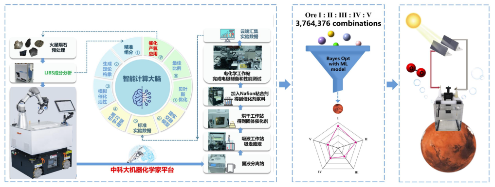 针对这些问题,中科大和深空探测实验室科研人员合作,利用自主研发的智能机器人“机器化学家”,从火星陨石中分析并提取成分,研制出一种新型制氧催化剂。