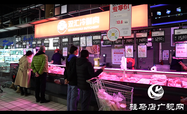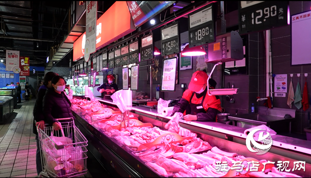 市民李阿姨站在超市柜台前精心挑选猪肉,为午饭做准备。
