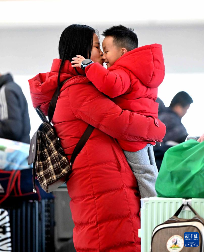 2月17日,在石家庄火车站候车大厅,一位母亲在亲吻自己的孩子。