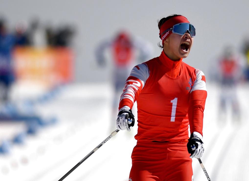 2月25日,黑龙江队选手靳然在冲刺时庆祝。新华社记者 黄博涵 摄