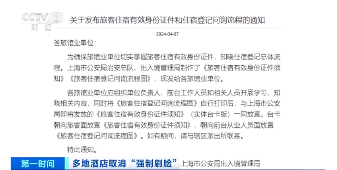 总台央视记者 左嘉玉:在上海,走进很多酒店都可以看到相关提示标语,上面写的第一条就是“严禁对已出示本人有效身份证件的旅客进行‘强制刷脸’核验”。记者在采访时也观察到,旅客们入住时只要出示自己的订单和本人的有效身份证件即可入住,并没有刷脸核验的操作。