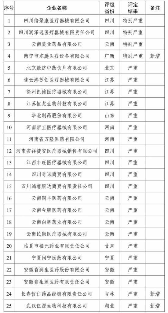 注2:根据医药企业信用评级,可采取提醒告诫、提示风险、披露失信信息,直至限制或中止该企业涉案或全部药品医用耗材挂网、投标或配送资格等处置措施。比如,对“严重”评级企业,采取取消涉案产品挂网和配送资格等处置措施;对“特别严重”评级企业,采取取消其所有产品挂网和配送资格等处置措施。